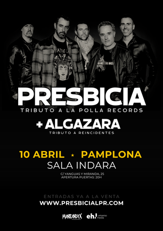 La Gira de PRESBICIA (Tributo a La Polla Records) junto a ALGAZARA (Tributo a Reincidentes) aterriza en MADRID para hacerte pasar una noche única. El proyecto PRESBICIA liderado por el actor DANIEL GUZMÁN rinde homenaje desde el corazón a uno de los músicos que más le ha influido en su vida, Evaristo Páramos, dando un extenso repaso a esos temas que aún siguen más presentes y vivos que nunca.
